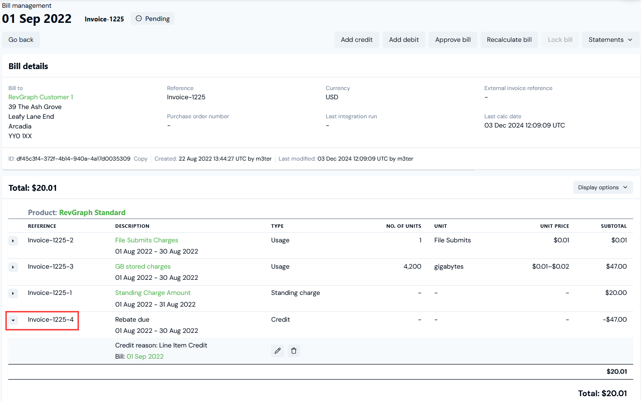 11. Select Create Credit line item. You are returned to the Bill details page, where the credit line item is shown and the bill is re-calculated to factor in the credit line item amount: