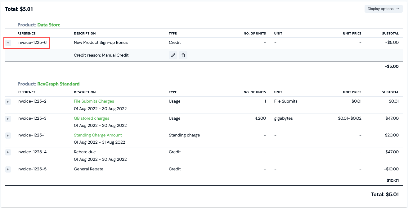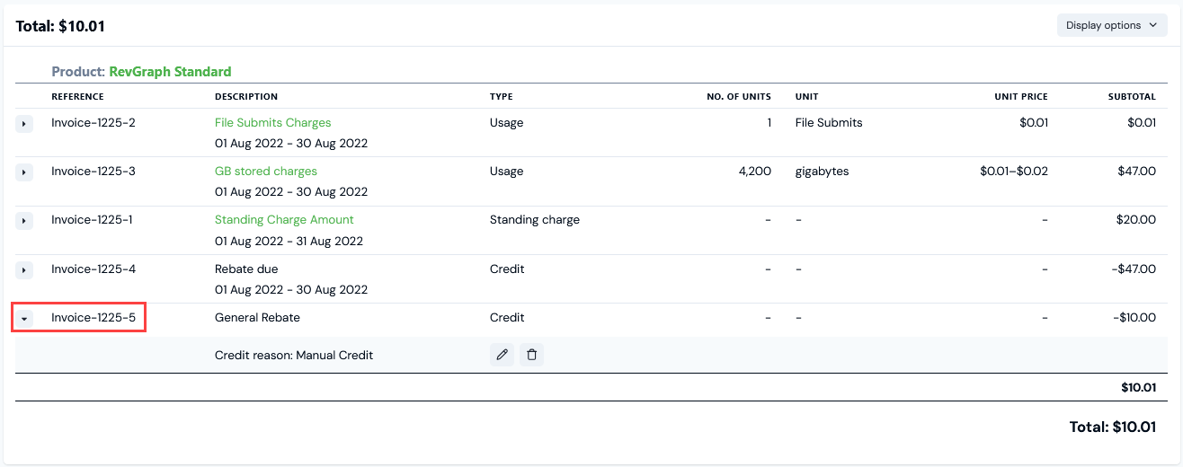 9. You can expand the manual credit line item to view details and Edit or Delete the credit line item.
