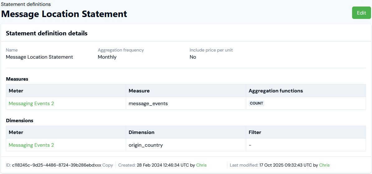 Another use case would be to provide a breakdown on the basis of location of usage charged for. For example, a text messaging service imposes a usage charge per billing period for all messages logged that originate from outside of a customer's native country. This usage is measured for the billing charge as a single block of total recorded usage, which results in a single usage charge line item for "other country" usage in customer invoices. But if the Meter collecting that usage is set up to also record a location for message events by country of origin, you can set up a Statement Definition that provides the required breakdown by the Meter's location dimension.