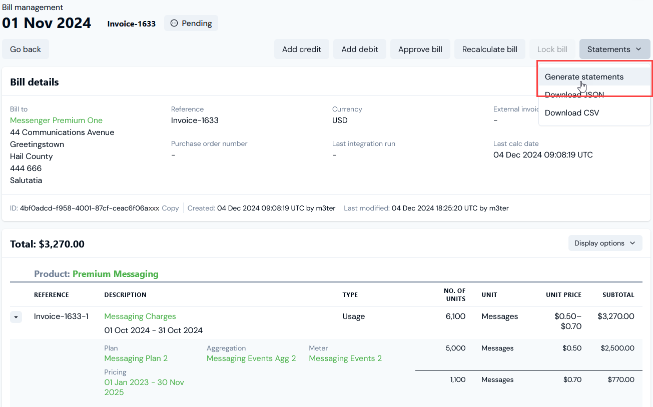 When the Statement has been generated for the Bill, you can download the Statement in JSON or CSV format, if you selected CSV format when generating the Statement.