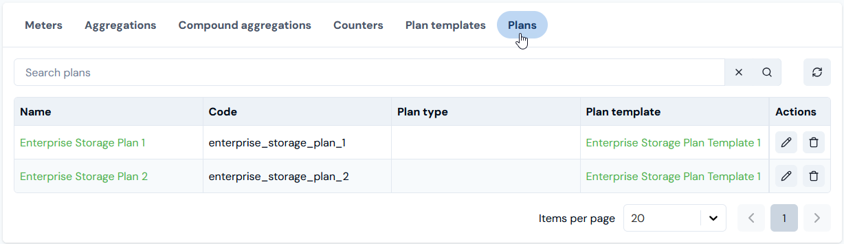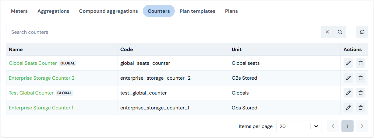 Note that if you select the Meters, Aggregations, Compound Aggregations, or Counters tab, then GLOBAL versions of these entities will also be listed because the global versions can also be applied to Products, such as a using a global Counter to price a Product Plan: