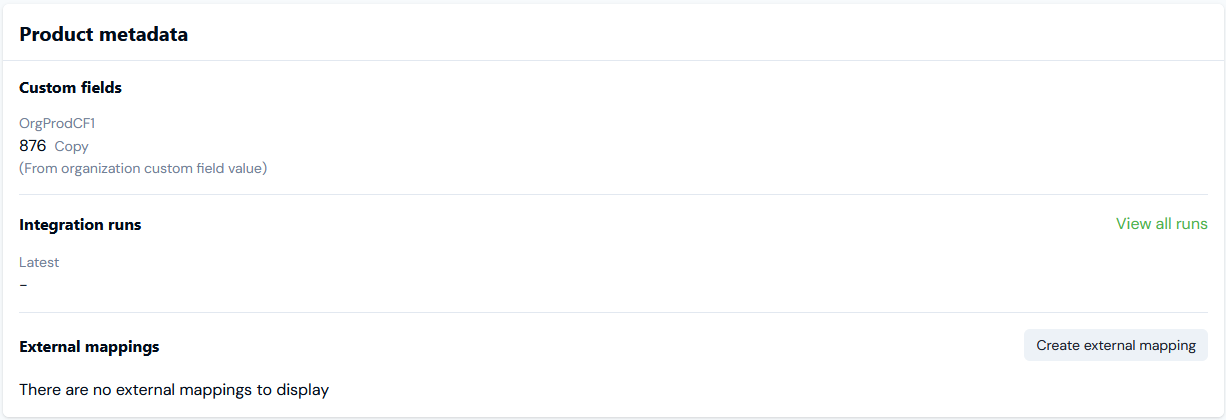 Integration runs. If you've set up an integration that synchronizes the Product with an external system, the date/time and status of the Latest integration run are shown. You can use a text hotlink to open details of this latest run or View all runs. See Reviewing Integration Run Details.