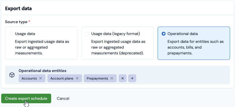 You can quickly set up scheduled exports of operational data such as Accounts, Bills, and Balances. Scheduled exports are incremental and designed to be easily integrated into downstream data tools.