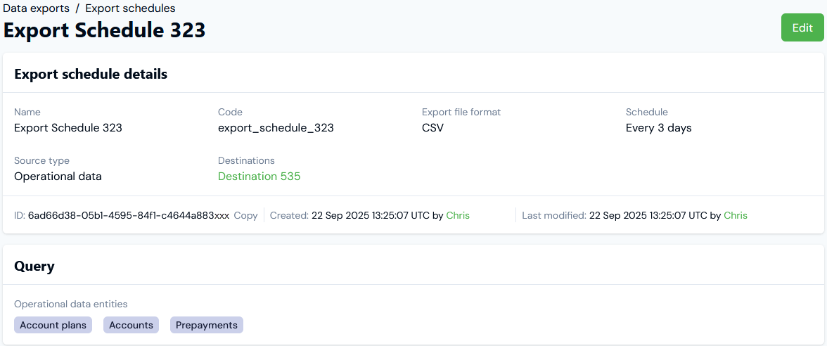6. When you have entered all details, select Create export schedule. The Export schedule details page opens:
