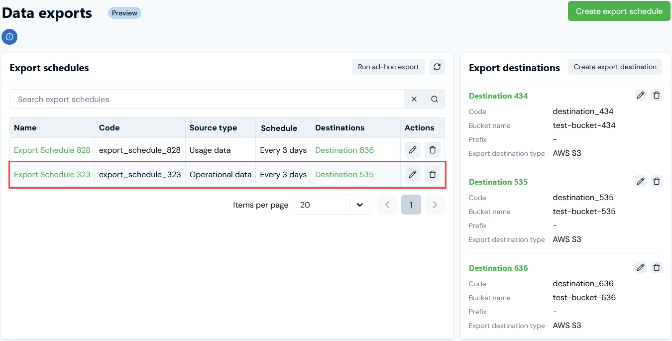When you have created some Export Destinations using S3 buckets in your AWS account or using buckets in your Google Cloud Storage account, you can set up Export Schedules to perform operational data exports into those destinations from your m3ter Organization.
