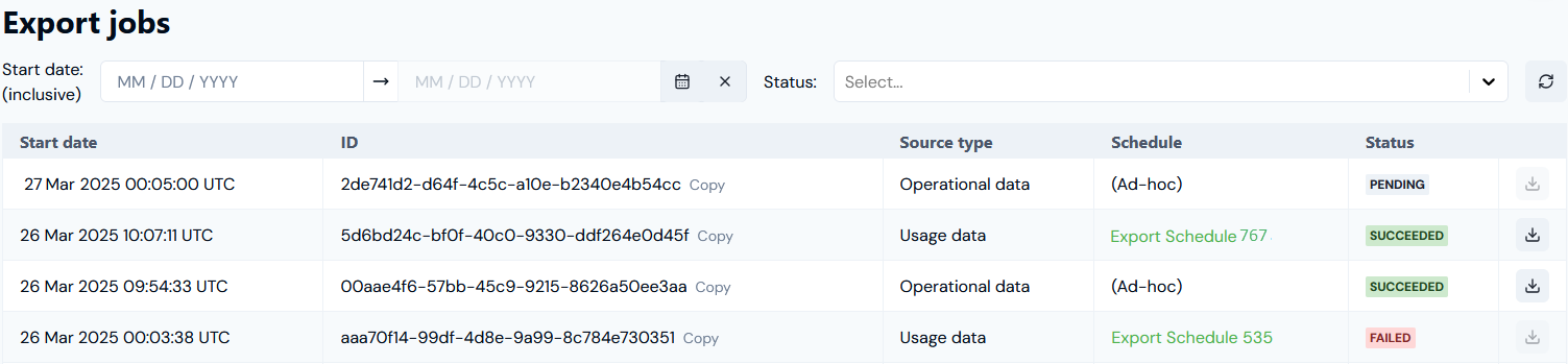 Export jobs are created each time a usage or operational data export is due to run under an Export schedule or when you run an ad-hoc data export. You can review and check the status of Export jobs at any time, which are listed on the Export jobs page: