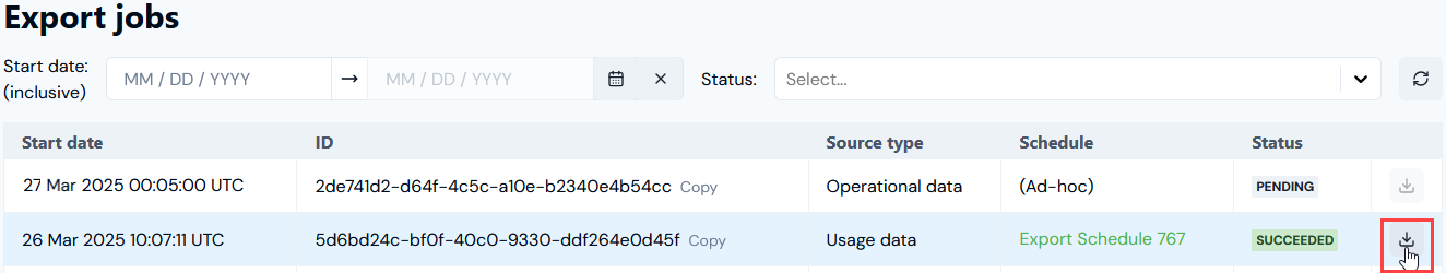 On the Export jobs page, an active download button will be available for downloading the export file locally for an Export job that has succeeded for an Export schedule or ad-hoc Export within the past 24 hours.