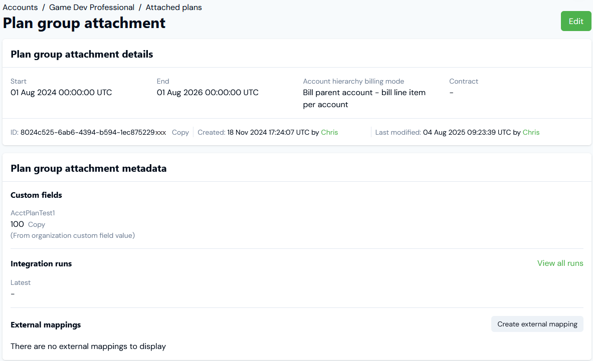 When you've attached a Plan Group to an Account, you can open a Plan Group Attachment page and review:
