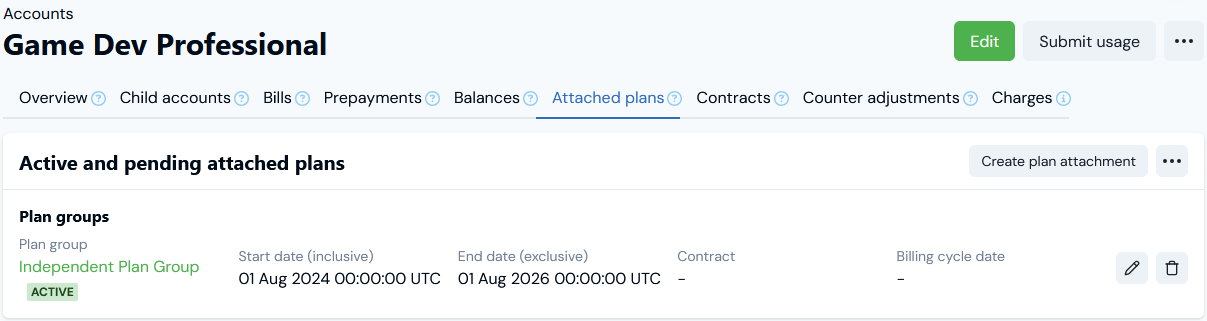 8. Select Create Plan group attachment. You are returned to the Account page Attached plans tab and the Plan Group is listed in the Active and pending attached plans panel under Plan groups. Attaching a Plan Group to an Account creates an Account Plan Group. The Account Plan Group will show as ACTIVE or INACTIVE or PENDING and the Start and End dates are also shown: