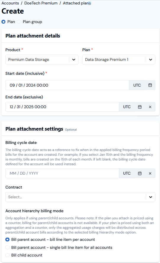 4. On the Plan attachment details card, enter the required details of the Plan you want to attach to the Account: