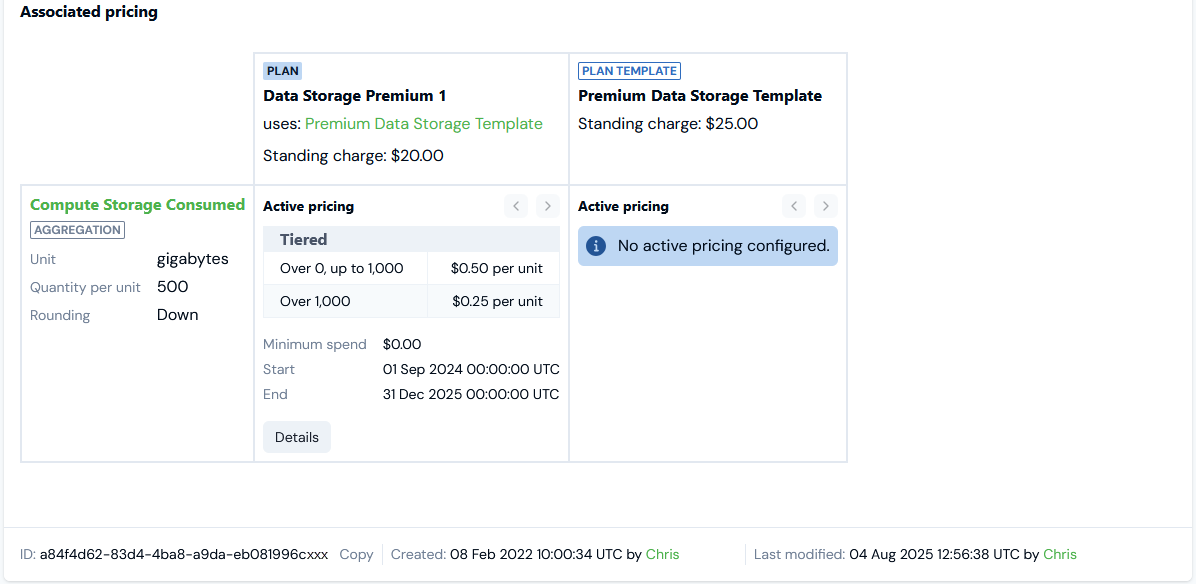 Select Details to open the Pricing details page and review full details of a pricing applied to the Plan.