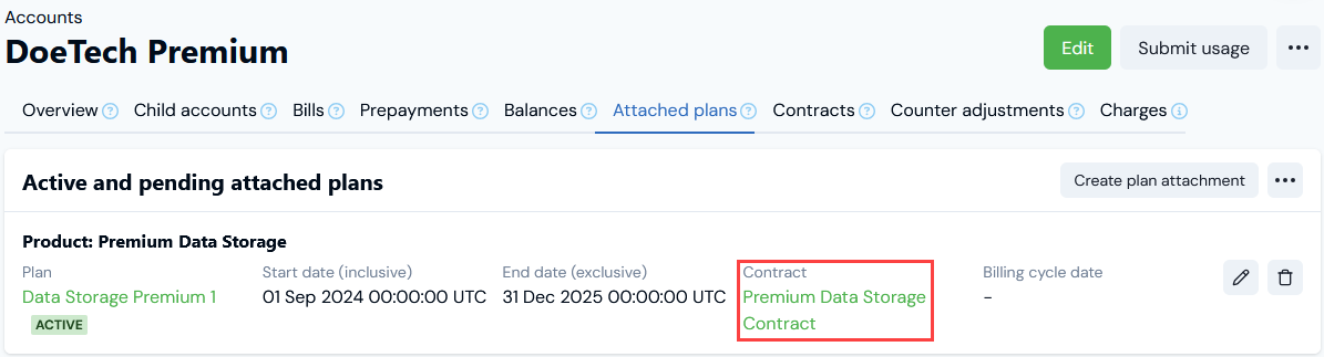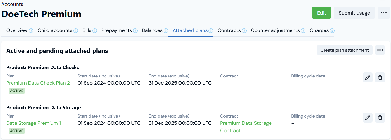 7. Select Create Plan attachment. You are returned to the Account page with the Attached plans tab selected. The Plan is listed in the Active and pending attached plans panel:
