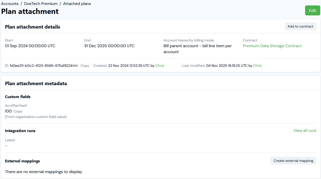 When you've attached a Plan to an Account, you can open a Plan attachment page and review details of the attachment.