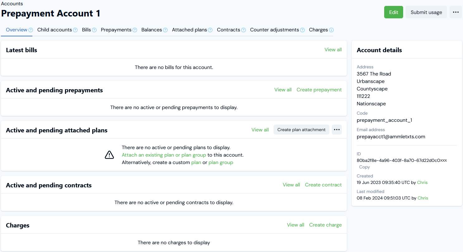 Your end customer Accounts will typically be created in m3ter as a result of an integration with one of your 3rd-party systems. However, you might need to create an Account manually during the set up phase of your Organization and for testing before you switch to a production environment. This topic explains how to create, manage, and delete Accounts in the Console: