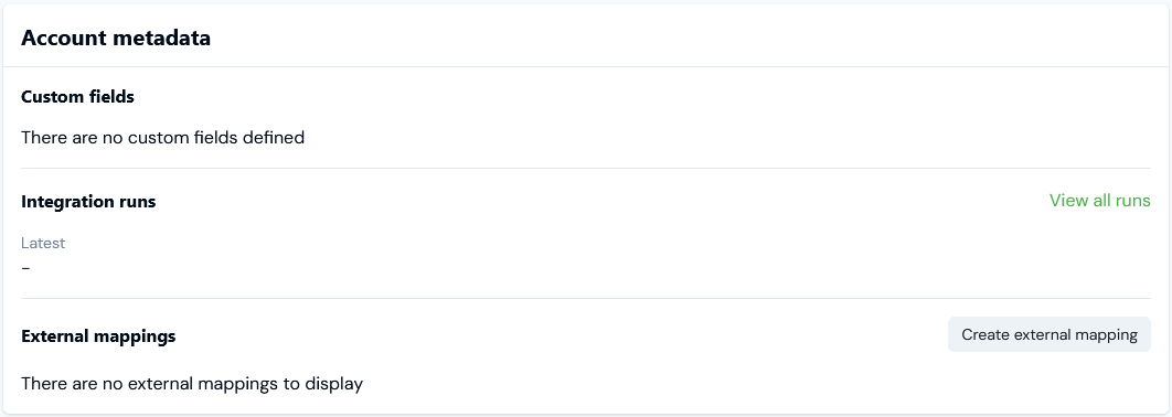 Integration runs. If you go on to set up an integration that synchronizes the Account with an external system, the date/time and status of the Latest integration run are shown. You can use a text hotlink to open details of this latest run or View all runs.