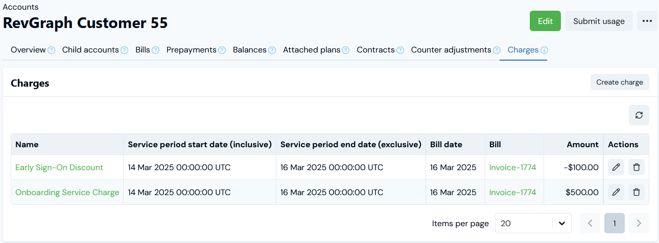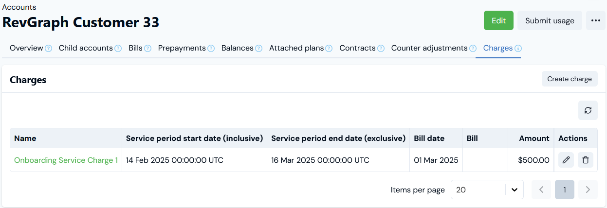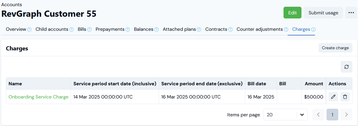 5. Select Create charge. You are returned to the Charges tab for the Account where the new Charge is listed: