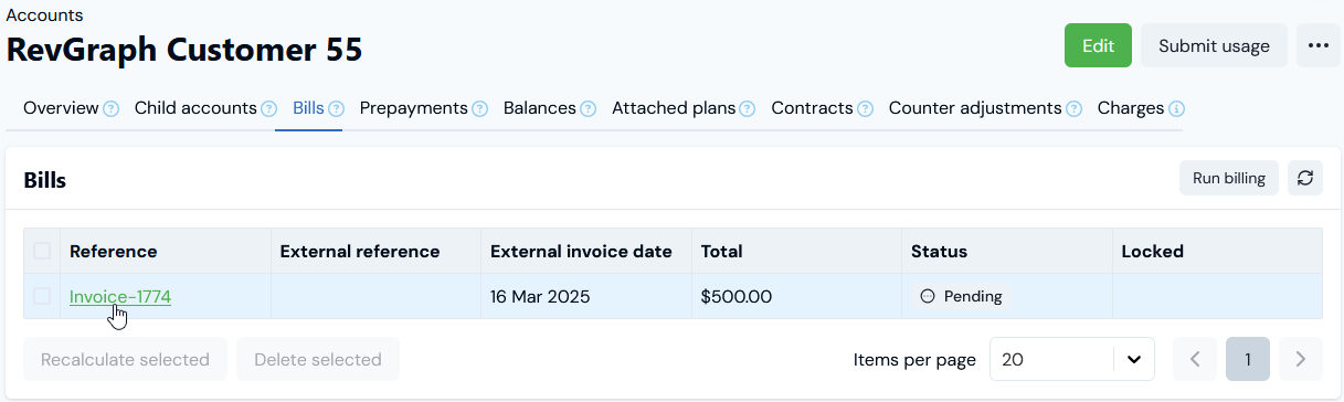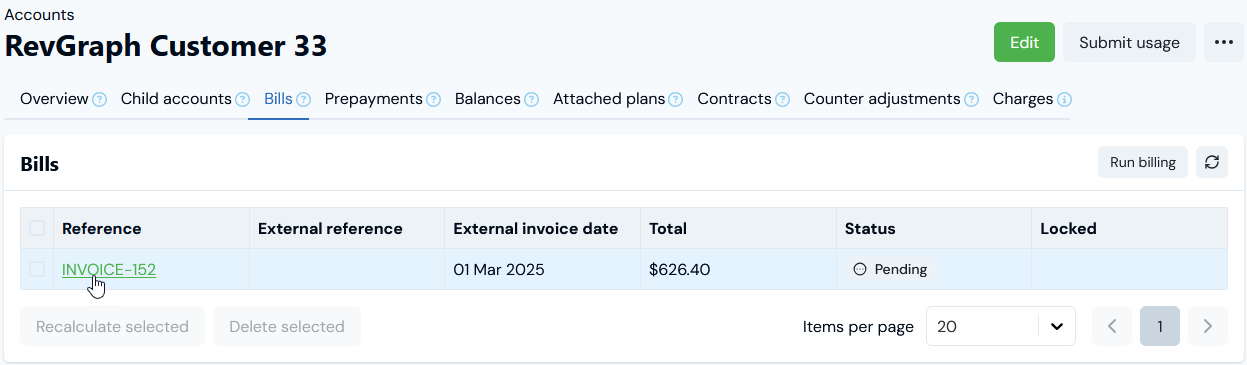 6. Select Run billing. The Bill for the ad-hoc Charge is generated and is listed on the Bills panel:
