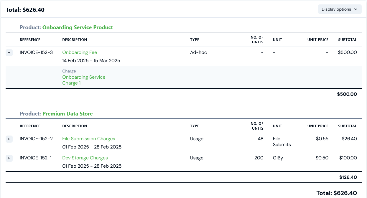 Important: Switch on Consolidated Bills for Organization! If you want to show ad-hoc Charges line items on the same Bills as other line item types - such as usage charges set up to be billed at monthly frequencies - you must switch on the Consolidate bills setting on in your Organization configuration. This will ensure different billing frequencies are consolidated into the same Bill. See Viewing and Editing Organization Configuration for more details.