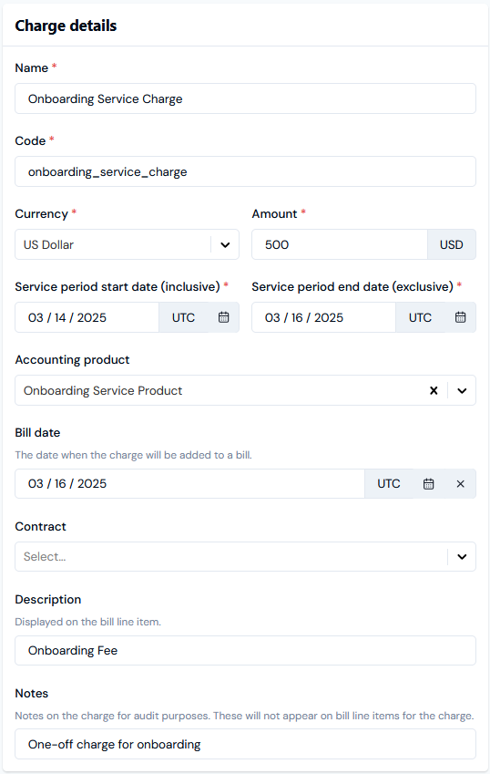 Contract. If you want to add the Charge to a Contract you've created for the Account, use the drop-down to select it. For more details on Contracts, see Creating Contracts for Accounts. (Optional)