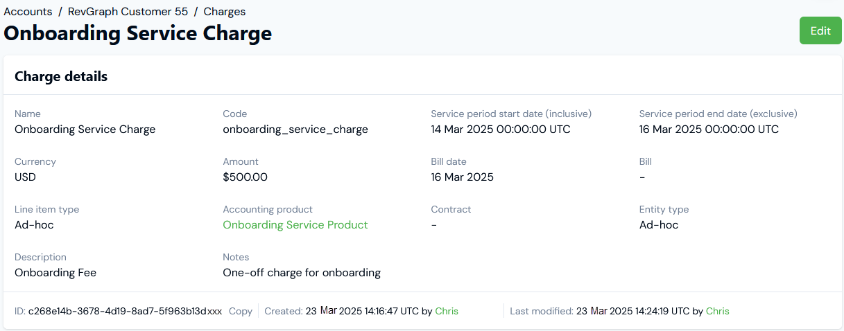 You can create ad-hoc Charges for your end-customer Accounts in m3ter directly from the Account details page. When you've created Charges for an Account, from the Charges tab you can review Charge details and edit or delete a Charge: