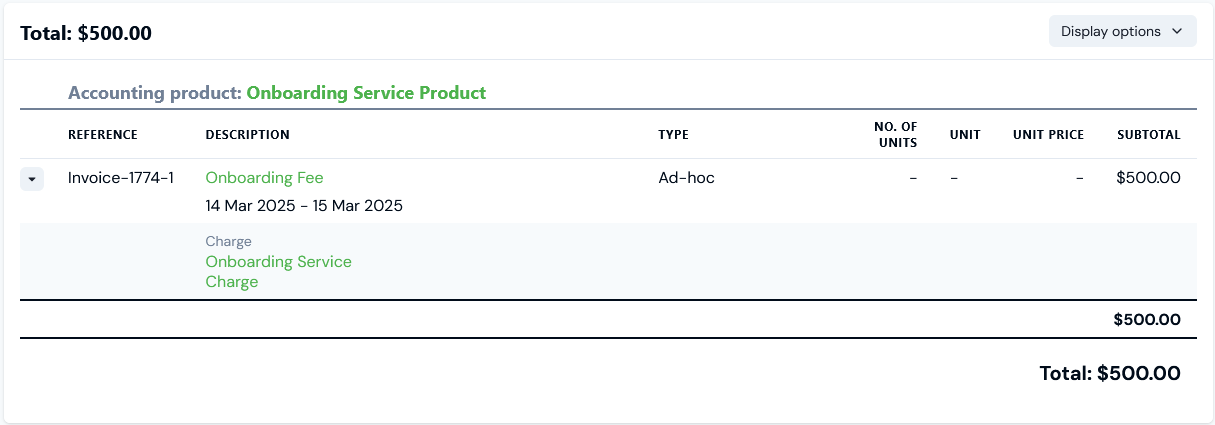 In this example a Charge will be created for a one-off onboarding fee of $500 against a new customer: