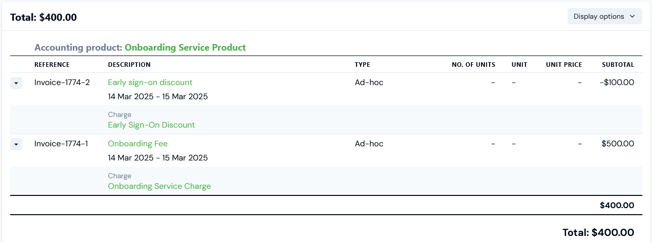 Suppose now that other ad-hoc Charges had been created for the same Account with the same Bill date. For example, the new customer was eligible for a discount against the normal onboarding fee for taking early sign-on. A negative ad-hoc Charge could be created for the Account and for the same Accounting product to cover this kind of case: