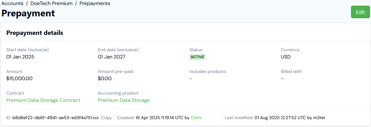 When you have created Prepayments for Accounts, you can open a details page to check fees and usage details, fee dates, and review a chart that tracks the consumption of the Prepayment over the active period for the Account: