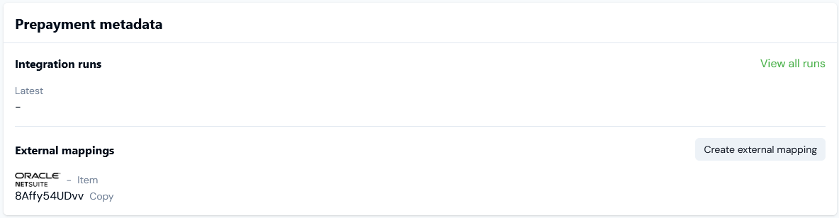 Integration runs. If you've set up an integration that synchronizes the Prepayement data with an external system, the date/time and status of the Latest integration run are shown. You can use a text hotlink to open details of this latest run or View all runs.