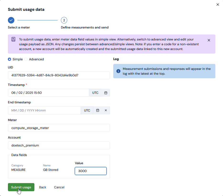 6. Select Submit usage. If the submission succeeds, under Log you'll see: