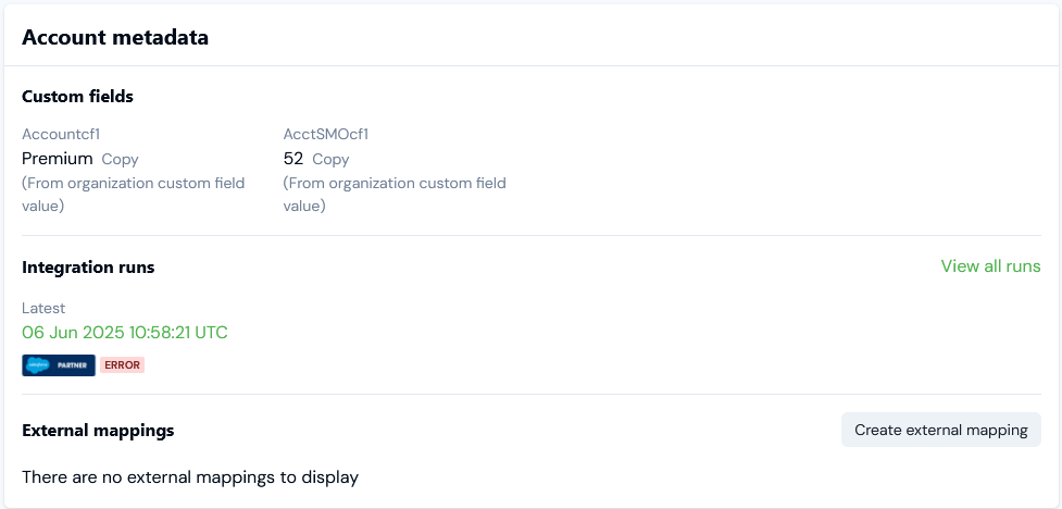 Integration runs. If you've set up an integration that synchronizes the entity with an external system, the date/time and status of the Latest integration run are shown. You can use a text hotlink to open details of this latest run or View all runs. See Reviewing Integration Run Details.