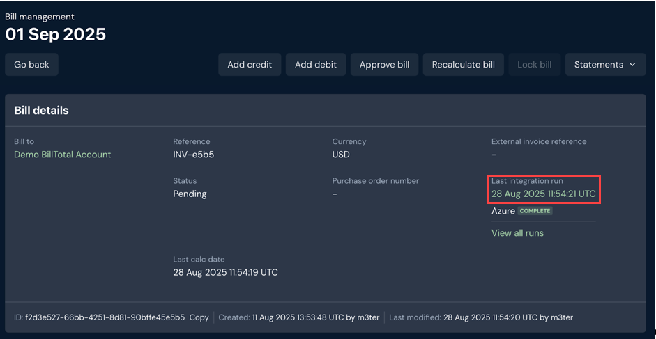 If you've set up an integration with an external system, m3ter allows you to review details of the integration runs that have been performed for the integration. For any Bills that have been included in an Azure Marketplace integration run, you can access and review details of the run directly from the Bill details in Bill management. For example: