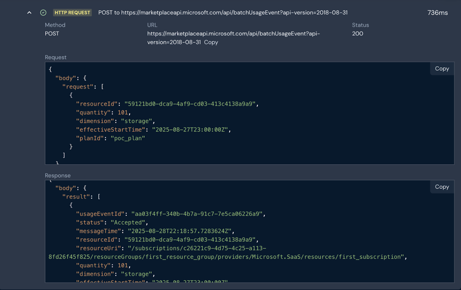 When Bill-based integration runs are performed, all interactions between m3ter and Azure Marketplace are persisted as logs. These logs are retrievable via a specific API endpoint, and you can use them to track, for each Bill, all amounts sent over to Azure Marketplace, together with the date and time the Bill data was sent. This provides a report on usage data sent to Azure Marketplace for each Bill integration run, and is particularly useful for Bill recalculation scenarios where several updates might have taken place during the billing period.
