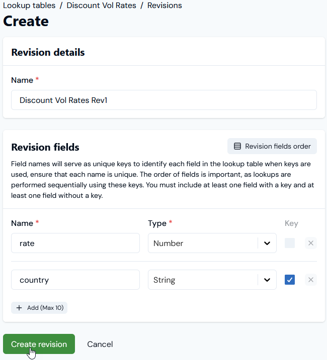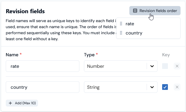 For the current example, we've created a Revision that contains a rate number field and a country string field and used the checkbox to define country as a Key field.