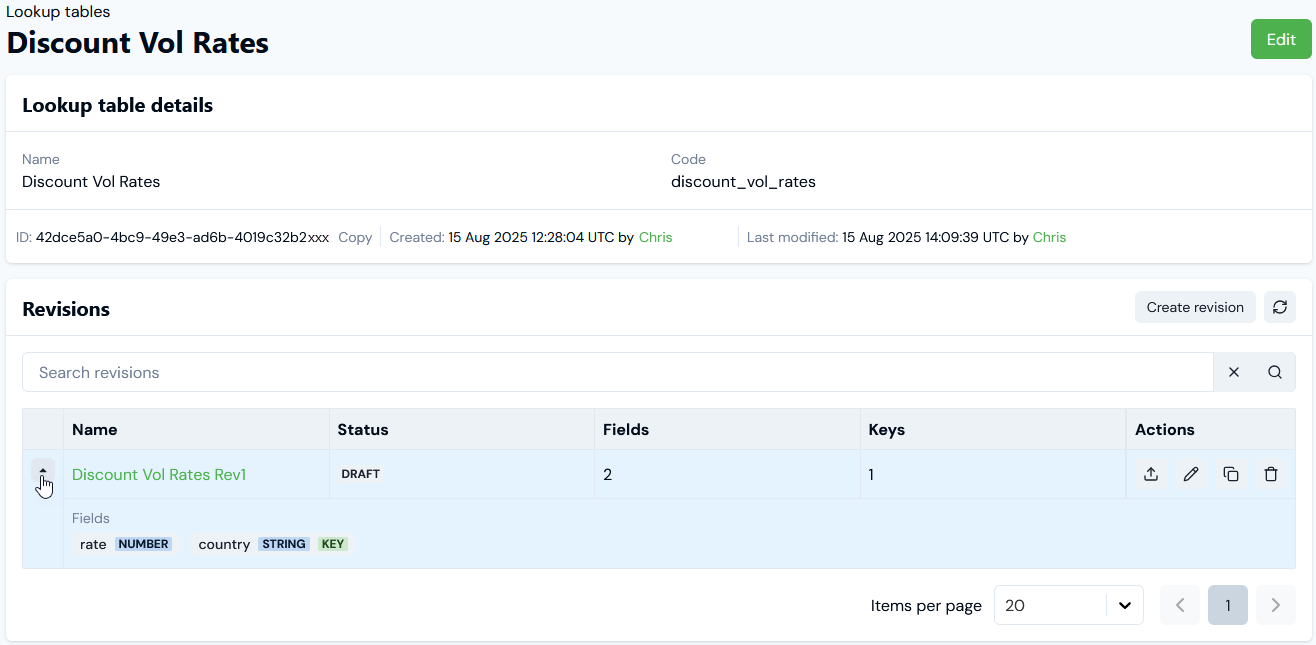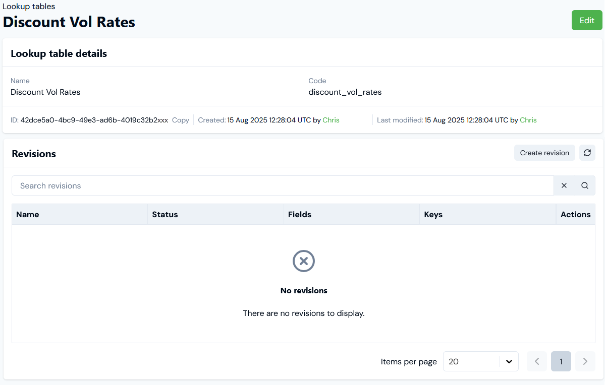 6. Select Create revision. You are returned to the Lookup table details page and the new Revision is listed: