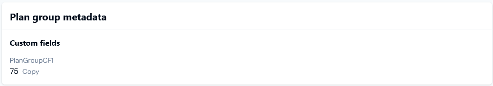 Custom fields. Any Custom fields created for the Plan Group entity are listed, and you can Copy the String or Number value of a Custom Field to your clipboard: