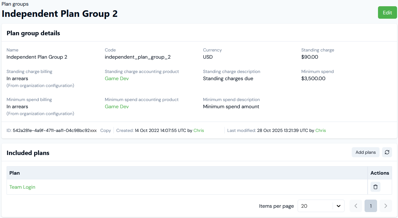 In this example, we've added a single Team Login Plan to the Independent Plan Group 2 Plan Group.