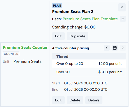 You can quickly price Plans in the Pricing Editor using Counters. We created the Premium Seats Counter for the current seat-based pricing example in the previous section. We've also set up in preparation for pricing using this Counter: