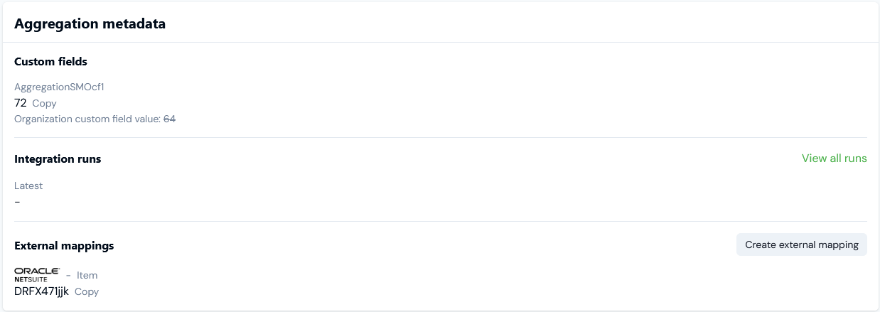 Custom fields. Any Custom fields created for the Aggregation entity are listed, and you can Copy the String or Number value of a Custom Field to your clipboard: