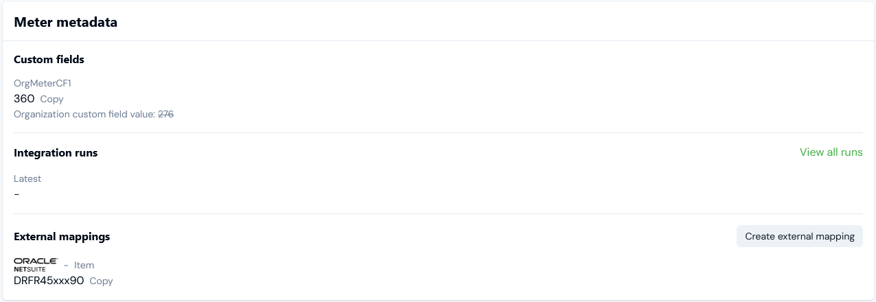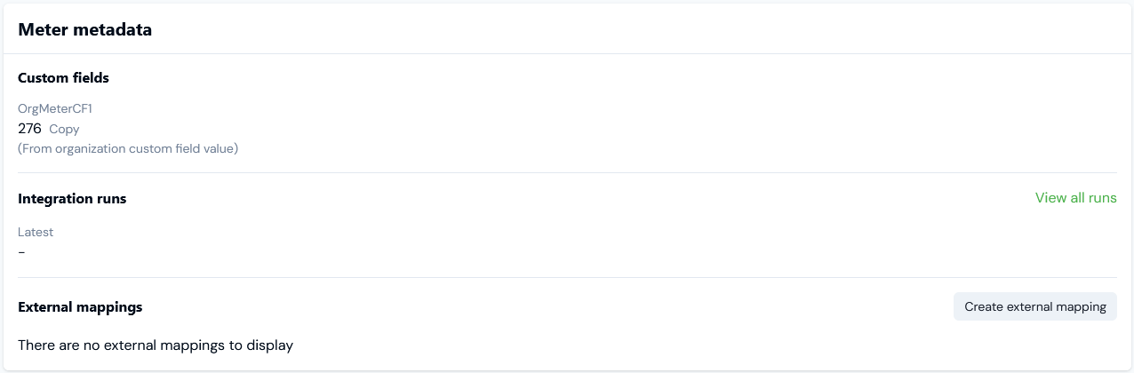 Integration runs. If you've set up an integration that synchronizes the Meter with an external system, the date/time and status of the Latest integration run are shown. You can use a text hotlink to open details of this latest run or View all runs. See Reviewing Integration Run Details.